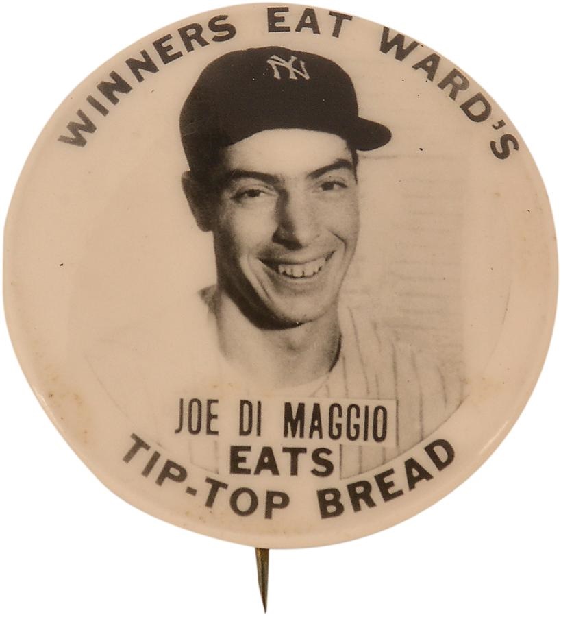 Tip High’s subsequent endeavor into utilizing sports activities and baseball particularly was a 1939, 1-1/4” pin with a black-and-white picture of Joe DiMaggio. The highest of the pin says, WINNERS EAT WARD’S and on the backside below the image it reads, JOE DI MAGGIO EATS TIP-TOP BREAD. Boxer Billy Conn and hockey participant Eddie Shore are two different identified athletes to make up a whole set of three pins. Whereas these pins are ridiculously scarce, they don’t essentially maintain numerous worth. The Normal Catalog of Classic Baseball Playing cards has DiMaggio’s pin listed at $500 in close to mint situation, nevertheless, a whole set of all three bought at a 2023 public sale for $260 {dollars} with DiMaggio’s pin in poor situation and the opposite two close to mint.