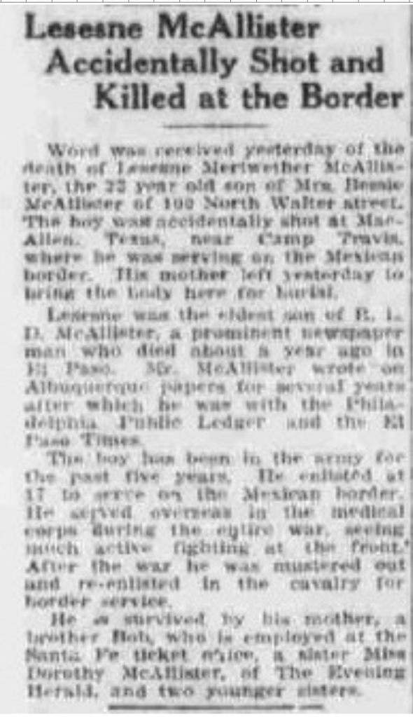 As for younger Lesesne, at 17 he joined the U.S. Military in 1915. He later served within the Medical Corps abroad throughout World Warfare I. Sadly, on October twenty first, 1920 the The Night Herald from Albuquerque, New Mexico reported him dying from pleasant fireplace in MacAllen, Texas close to Camp Travis. He was there engaged on the Mexican border whereas serving within the U.S. Military. As with all historical past it is very important perceive what was taking place on the time. The Military wasn’t there in 1920 due immigration. The Military was there to guard in opposition to Mexican Revolutionary forces led by Pancho Villa.