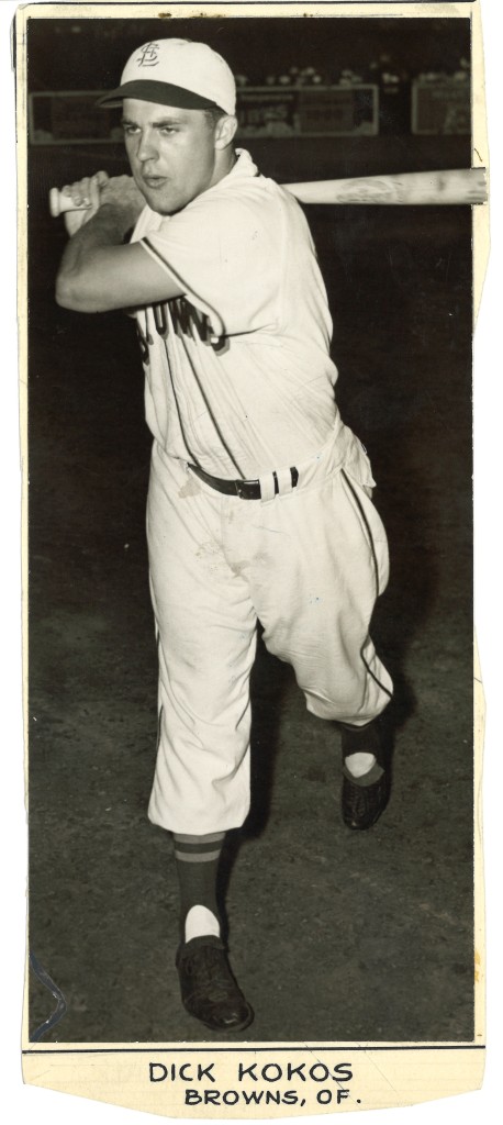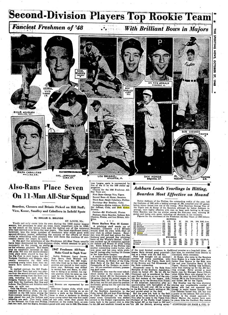 I started in search of different assortment items of Dick Kokos and have discovered this similar picture in a The Sporting Information press picture from the “The John Rogers Archive,” and on what was listed as a “1949 Louisville Slugger” commercial. Utilizing the analysis instruments out there through SABR membership, I’ve discovered the picture was utilized in an October 27, 1948 unfold titled “Second-Division Gamers High Rookie Staff.”